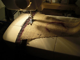 To attach the triangles, sew to a piece of material. Last year at a garage sale I found a whole bolt of homespun material that was perfect and long enough that I was able to use one piece of material instead of sewing a few pieces together.