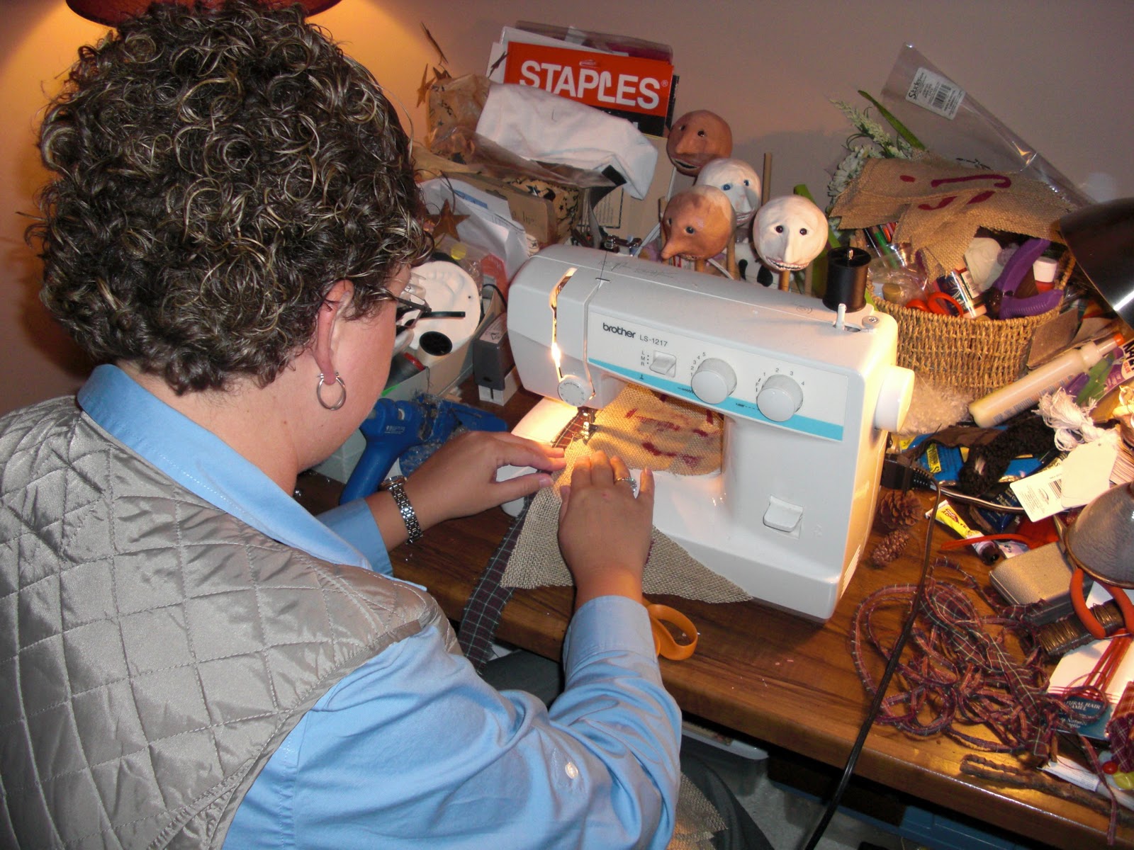 Action pose! Luckily I have a craft room that I can just close the door and forget about, this is not the best scenerio for trying to sew! My santa heads are drying in the background!